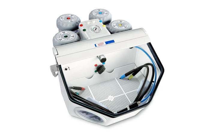 Jateador de precisão profissional com 2 a 4 reservatórios. Trabalho econômico devido à tecnologia especial da câmara misturadora (princípio Venturi). Limpeza fácil das mãos e dos objetos com o bico de sopro integrado. Grande liberdade de movimentos devido à ampla câmara de jateamento (20 l). Jateamento preciso graças à iluminação ideal da câmara de jateamento por meio da tecnologia LED. Boa visibilidade constante dos objetos devido vidro revestido de silicone.